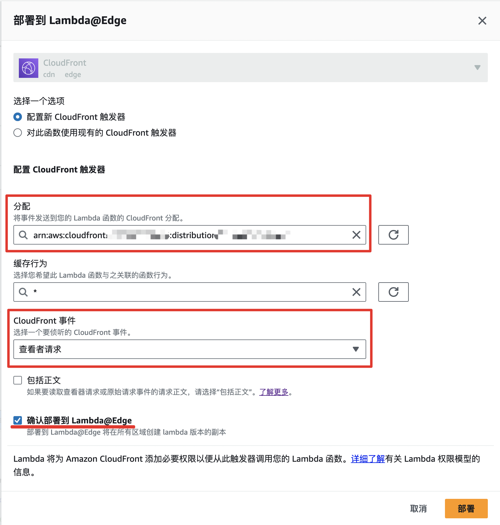 Lambda 函数上传完成后需要部署到 Lambda@Edge 上才能生效。